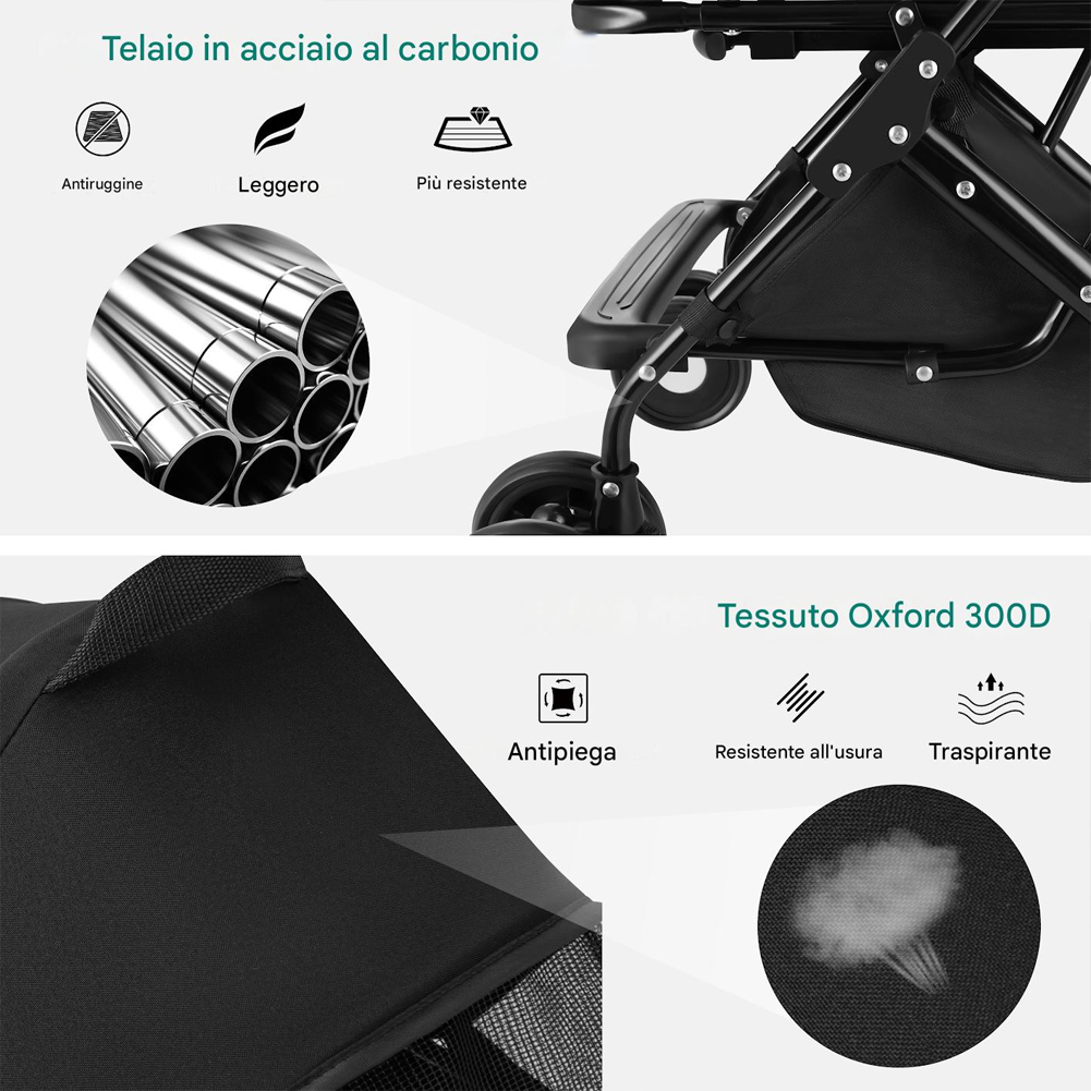 Questo passeggino per animali è dotato di una barra di traino ergonomica che ti consente di utilizzarlo non solo come classico stroller ma anche come rimorchio a mano, rendendolo ideale per escursioni più lunghe, fiere, o situazioni dove spingere non è comodo. La versatilità è il suo vero punto di forza.Il telaio in acciaio al carbonio da 16 mm con spessore tubolare di 0,7 mm assicura stabilità e durata nel tempo. Progettato per sostenere fino a 40 kg di carico complessivo e 20 kg nella navicella, è ideale anche per animali di taglia medio-piccola o più pesanti rispetto alla media.Le ruote in schiuma EVA da 5 pollici garantiscono una guida stabile e silenziosa su ogni tipo di superficie, dall’asfalto ai percorsi leggeri sterrati.Perfette per garantire un’esperienza di passeggio fluida, sicura e senza sobbalzi, anche con animali che si agitano facilmente.Grazie al sistema di chiusura compatto, può essere facilmente riposto in auto o in casa senza occupare spazio.Il cestello inferiore portaoggetti ti consente di portare con te tutto il necessario: snack, giochi o accessori per il tuo amico a quattro zampe. Praticità e funzionalità in un unico prodotto.SPECIFICHE PRODOTTO:Dimensioni da aperto: 960 × 550 × 500 mmDimensioni abitacolo: 550 × 320 × 500 mmTelaio: Acciaio al carbonio da 16 mmSpessore tubo: 0,7 mmRivestimento: Verniciatura a spruzzo in plasticaTessuto: Oxford 300D tecnico e resistenteRuote: Schiuma EVA da 5"Capacità navicella: 20 kgCapacità struttura: 40 kgFunzione speciale: Barra di traino per trasporto manualeCONTENUTO DELLA CONFEZIONE:1 x Passeggino per Cani e Gatti con Traportino Rimovibile per Animali Domestici Nero