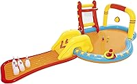 Dimensioni:: 4.35 m x 2.13 m x 1.17 m Capacità acqua: 314 L Scivola giù per lo scivolo e cerca di fare strike abbattendo tutti i birilli Divertente scivolo rimovibile Contenuto: 1 piscinetta, 6 birilli, 1 canestro, 2 anelli gonfiabili, 4 palline da gioco, 1 toppa di riparazione