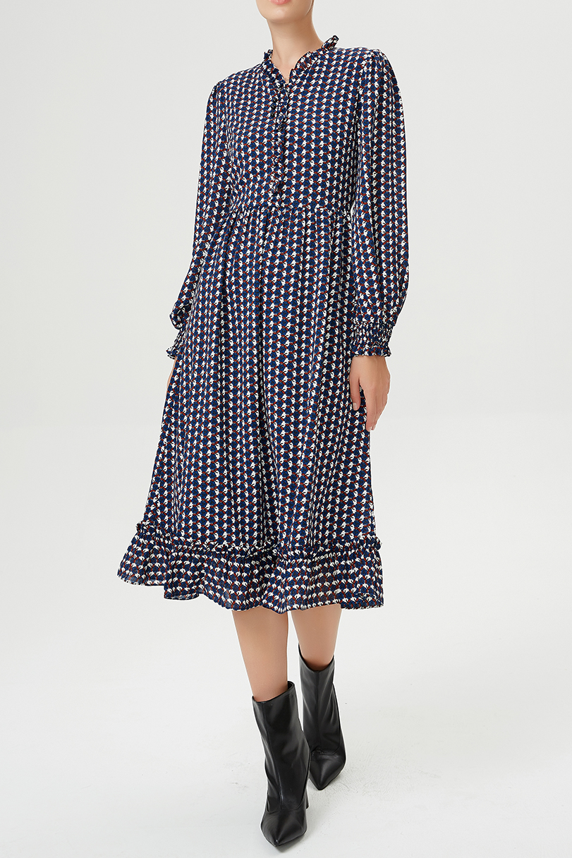 Een moeiteloos stuk dankzij de losse snit op de mouwen en het royale volume. Onderstreept subtiel het silhouet door zijn gepaste taille en polsen. Discrete V-hals versierd met kleine ruches. Een verfijnde en veelzijdige jurk om zonder moderatie te dragen tijdens uw stadswandelingen en uw kantoordagen. Kan worden gedragen met laarzen, enkellaarzen, stiletto's of sneakers volgens je humeur. Productdetails: Vorm: trapeze Lengte: 115 cm; onder de knie Lange mouwen Geknoopte nek V Het model meet 1m75 en draagt maat 38