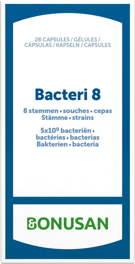Qué es BONUSAN BACTERI 8 28 CAPS?BONUSAN BACTERI 8 28 CAPS es un suplemento probiótico diseñado para mejorar la salud intestinal y el equilibrio de la flora intestinal. Este producto contiene una mezcla exclusiva de 8 cepas de bacterias beneficiosas seleccionadas para proporcionar apoyo digestivo y fortalecer el sistema inmunológico.¿Cuáles son los beneficios de BONUSAN BACTERI 8 28 CAPS? Apoyo digestivo: Promueve una digestión saludable y alivia problemas digestivos como el estreñimiento y la hinchazón. Equilibrio de la flora intestinal: Ayuda a mantener un equilibrio saludable de bacterias en el intestino. Refuerzo del sistema inmunológico: Fortalece las defensas naturales del cuerpo. Mejora la absorción de nutrientes: Facilita una mejor absorción de vitaminas y minerales esenciales. Reducción de infecciones: Proporciona una mayor protección contra patógenos intestinales.FormatoBONUSAN BACTERI 8 28 CAPS está disponible en formato de cápsulas, lo que facilita su consumo y dosificación diaria. Cada envase contiene 28 cápsulas, suficiente para un suministro de cuatro semanas.Sabores disponiblesBONUSAN BACTERI 8 28 CAPS no contiene sabores añadidos, ya que las cápsulas están diseñadas para ser ingeridas directamente, proporcionando todos los beneficios sin alterar el sabor.¿Cómo tomar BONUSAN BACTERI 8 28 CAPS?Si no hay consejo diferente, se recomienda tomar una cápsula al dÃa. Preferiblemente en ayunas antes de acostarse o bien media hora antes del desayuno. No sobrepasar la dosis diaria recomendada.IngredientesLos ingredientes de BONUSAN BACTERI 8 28 CAPS incluyen: Fructooligosacáridos (FOS), mezcla de cepas bacterianas (Lb. acidophilus LA1, Lb. casei BGP93, Lb. reuteri LR92, Lb. rhamnosus LR1, Lc. lactis SP38, Bb. bifidum SP9, Bb. breve BB18, Bb. longum SP54), pared de la cápsula (hidroxipropilmetilcelulosa, goma gellan), inulina, pared de la cápsula (hidroxipropilmetilcelulosa, goma gellan). Composición por cápsula:Mezcla de cepas bacterianas: Lb. acidophilus LA1, Lb. casei BGP93, Lb. reuteri LR92, Lb. rhamnosus LR1, Lc. lactis SP38, Bb. bifidum SP9, Bb. breve BB18, Bb. longum SP54: 5 x 10â�¹ UFC Fructooligosacáridos (FOS): 300 mgComprar BONUSAN BACTERI 8 28 CAPSPuedes adquirir BONUSAN BACTERI 8 28 CAPS en tiendas de productos naturales, farmacias especializadas y a través de diversas plataformas en lÃnea. Asegúrate de comprarlo en lugares confiables para garantizar la autenticidad y calidad del producto.BONUSAN BACTERI 8 28 CAPS es una excelente opción para quienes buscan mejorar su salud intestinal de manera natural y efectiva. Con su combinación única de cepas probióticas, este suplemento ofrece una solución completa para mantener tu microbioma intestinal en óptimas condicione