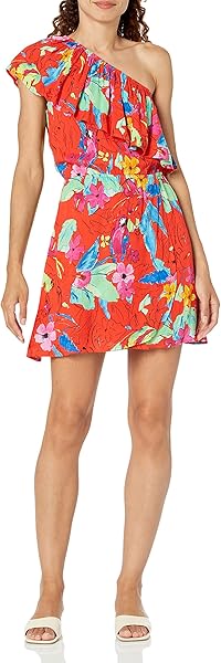 Vestido corto, asimétrico, sin mangas, cruzado en el bajo, con volantes en el escote y un arty esta…