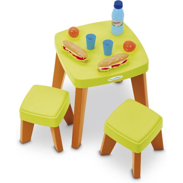 Tavolo da picnic per bambini a partire da 12 mesi, dotato di 2 panini, 2 pezzi di frutta, 2 tazze, 1 bottiglia d'acqua e 2 sgabelli per una comoda seduta sia all'interno che all'esterno.In totale 11 pezzi.Altezza del sedile: 20 cm.Altezza del tavolo: 38 cm.