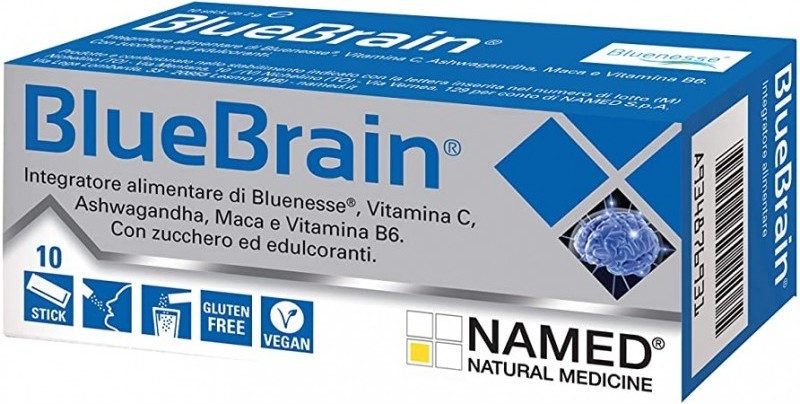 ue BrainComplemento alimenticio Contenido: 20g (10 sobres de 2 g)Complemento alimenticio de Bluenesse®, Vitamina C, Ashwagandha, Maca y Vitamina B6 con azúcar yedulcorantes.INGREDIENTES - Edulcorantes: Sorbitol, Xilitol, Sucralosa,glucósidos de esteviol (de Stevia rebaudiana); Fructosa, Bluenesse® (Melissa officinalis L.),extracto seco de hojas tit.6% de ácido rosmarínico, Aromas, Vitamina C (ácido Lascórbico),Ashwagandha (Withania somnifera (L.) Dunal) extracto seco de raíz tit.2,5% de withanólidos, extracto seco de raíz de Maca (Lepidium meyneii Walp) tit.0,5% de betaecdisona, Acidificante: ácido cítrico; Antiaglomerante: dióxido de silicio; Vitamina B6 (clorhidrato de piridoxina).La vitamina C y la vitamina B6 para el funcionamiento normal del sistema nervioso y la reducción del cansancio y la fatiga.La vitamina C para la protección de las células contra el estrés oxidativo.La vitamina B6 para el funcionamiento normal del sistema inmunitario.MODO DE EMPLEO: disolver un sobre directamente en la boca en el momento de la necesidad o diluirlo en medio vaso de agua.También puedes tomar 1 o 2 sobres al día, 1 por la mañana y 1 por la tarde, o diluir el contenido de los dos sobres en 1 litro de agua y consumirlo durante el día.ADVERTENCIAS: No superar la dosis recomendada.Mantener fuera del alcance de los niños pequeños.Los complementos alimenticios no deben sustituir a una dieta variada y equilibrada y a un estilo de vida saludable.Un consumo excesivo puede tener efectos laxantes.ALMACENAMIENTO: evitar la exposición a fuentes de calor localizadas, a la luz solar y mantenerlo alejado de la humedad.La vida útil mínima se refiere al producto correctamente almacenado en un envase sin abrir.No dispersar en el medio ambiente después de su u