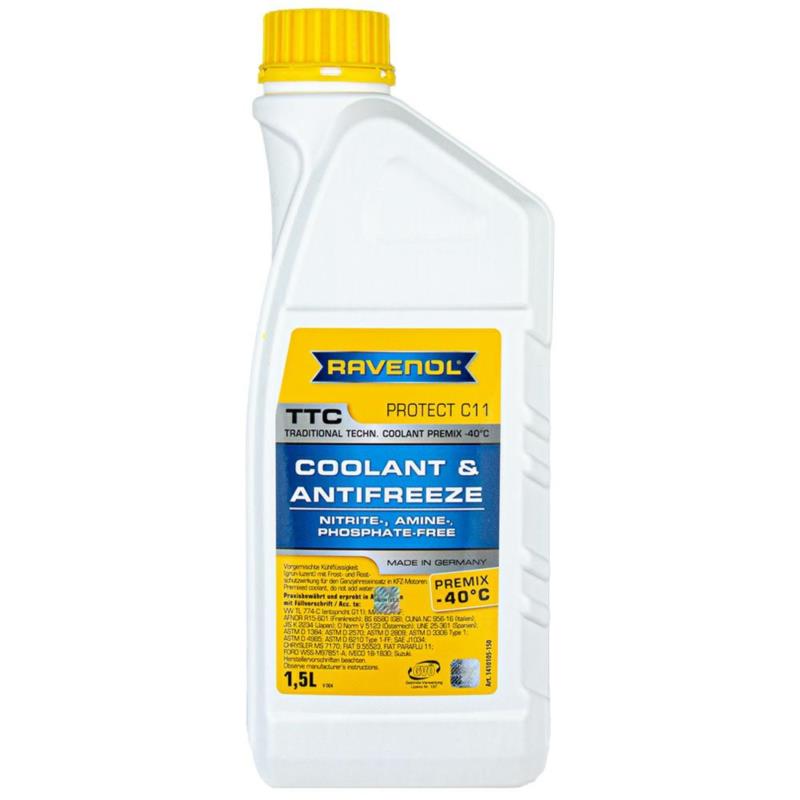 RAVENOL TTC Traditional Technology Coolant Premix -40oC to gotowy do użycia, wstępnie rozcieńczony płyn do chłodnic oparty na glikolu etylenowym, niezawierającym fosforanów, azotynów i amin, sformułowanym na bazie sprawdzonych dodatków, jako płyn o przedłużonym okresie użytkowania.