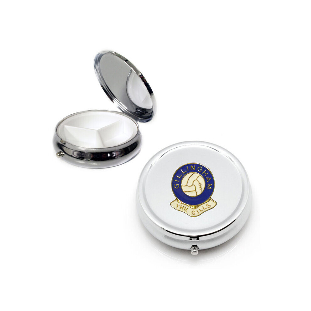Portapillole rotondo in argento con finitura cromata lucida. Logo smaltato Gillingham Football Club…