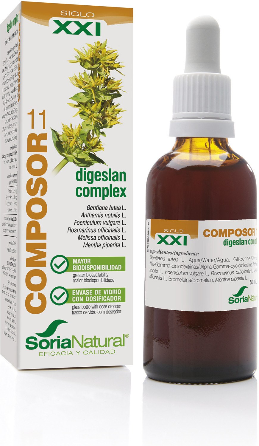 mposor 11 Digeslan Complex (Fórmula XXI) de Soria Natural, ha conseguido mejorar el funcionamiento de la GAMA COMPOSOR, que ha sido capaz de permanecer más de 30 años en el mercado por su eficacia, siendo la referencia de la fitoterapia en España y en el mundo.El uso de las ciclodextrinas, junto con un novedoso proceso de extracción de los principios activos de las plantas más rápido y eficaz, estandarizado para que cada dosis tenga siempre la misma actividad terapéutica, nos permite ofrecer a los usuarios de esta familia líder del mercado la nueva Gama Composor Siglo XXI, más beneficiosa y efectiva para el organismo.Indicado en malas digestiones de origen nervioso,DispepsiasFlatulencias gástricasDificultad en el vaciado del estómagoEspasmos abdominales y atonías gástricas e intestinalesProblemas hepato-biliares, sobre todo en los producidos por una disminución en la formación y evacuación de la bilis.Se recomienda en adultos tomar 2 o 3 veces al día diluido con un poco de agua.Agitar antes de usar.Apretar la tetina y esperar unos segundo