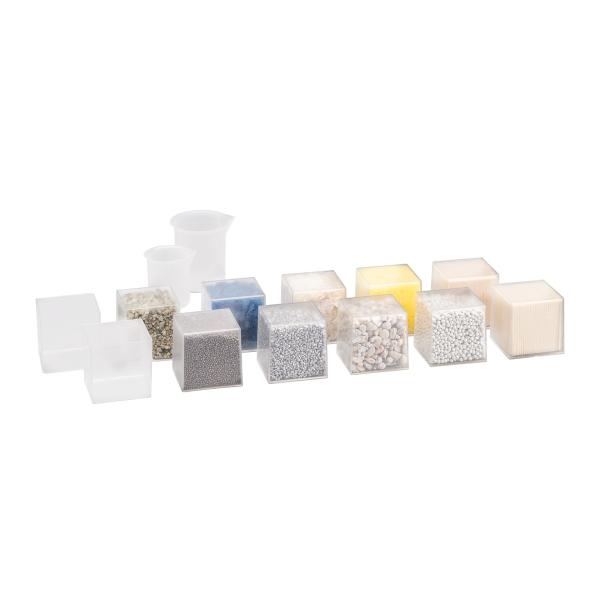 Das Set enthält 10 Würfel, die mit verschiedenen Materialien wie Federn, Wolle, Bimsstein, Kies, Balsaholz, Fichte, Schaumstoff, Kunststoff, Aluminium und Eisen gefüllt sind, sowie 9 leere Würfel. Außerdem 2 Messbecher mit einem Volumen von 50 und 100 ml. Mit diesem Set lernen Sie die korrekte Verwendung von Begriffen und das Treffen von Annahmen wie „schwerer als...“, „einfacher als...“, „gleich schwer wie...“. Schätzen und vergleichen Sie das Gewicht, geeignet für die direkte Handhabung verschiedener Materialien zur Entwicklung von Vorstellungen über Größe. Hergestellt aus 100% recyceltem Kunststoff und nach der Verwendung wiederverwertbar. Hauptmerkmale: enthält 10 Würfel mit Materialien, 9 leere Würfel, 2 Messbechererste spielerische Erfahrungen mit Physik, Chemie und Mathematikin Deutschland hergestellt